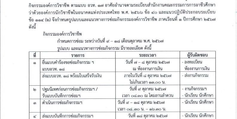 ข่าวประชาสัมพันธ์ กำหนดการ รูปแบบ และแนวทางการซ่อมกิจกรรมองค์การวิชาชีพ ภาคเรียนที่ 1 ปีการศึกษา 256 admin@thatum1 ตุลาคม 10, 2024