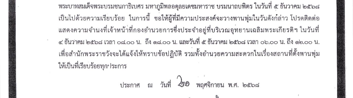 ข่าวประชาสัมพันธ์ ประกาศสำนักพระราชวัง เรื่อง การวางพานพุ่มถวายบังคมพระบรมราชานุสาวรีย์พระบาทสมเด็จพระบรมชนกาธิเบศรมหาภูมิพลอดุลยเดชมหาราช บรมทนาถบพิตร เนื่องในวันคล้ายวันพระบรมราชสมภพ ประจำปีพุทธศักราช 2568 admin@thatum1 ธันวาคม 17, 2025