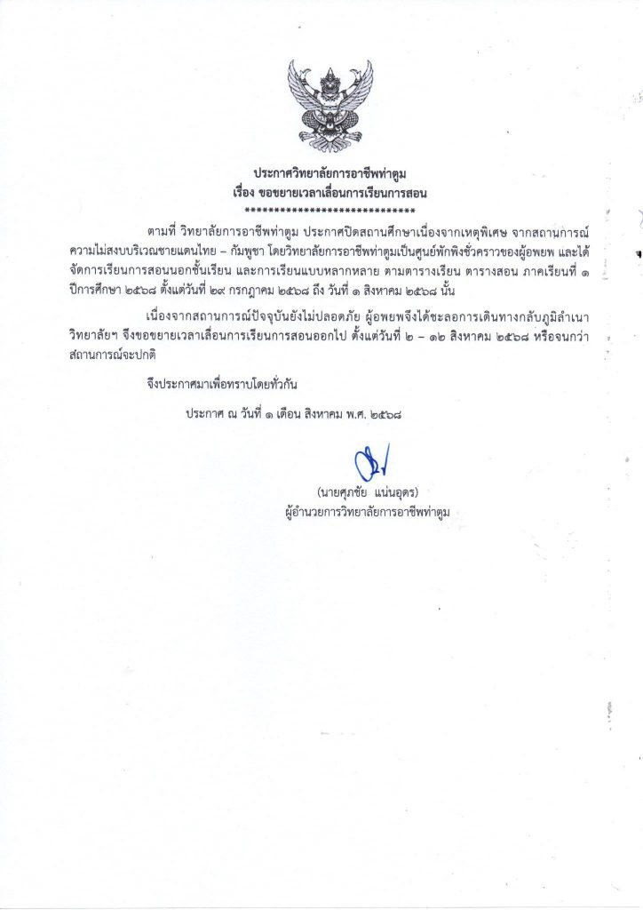 Homepageข่าวประกาศขยายเวลาเลื่อนการจัดการเรียนการสอน ข่าวประกาศ ขยายเวลาเลื่อนการจัดการเรียนการสอน อ่านแล้ว: 23 LEAVE A RESPONSE ยกเลิกการตอบอีเมลของคุณจะไม่แสดงให้คนอื่นเห็น ช่องข้อมูลจำเป็นถูกทำเครื่องหมาย *ความเห็น * ชื่อ * อีเมล * เว็บไซต์ บันทึกชื่อ, อีเมล และชื่อเว็บไซต์ของฉันบนเบราว์เซอร์นี้ สำหรับการแสดงความเห็นครั้งถัดไป แนะแนวเรื่อง Previous Postวันที่ 25 ก.ค.68 วันเฉลิมฯ พระวชิรเกล้าเจ้าอยู่หัว Next Postขอแสดงความยินดีและขอขอบคุณ วิทยาลัยการอาชีพท่าตูมได้รับ รางวัลสถานศึกษาพระราชทาน ระดับอาชีวศึกษา ประเภทสถานศึกษาขนาดใหญ่ ประจำปีการศึกษา ๒๕๖๗