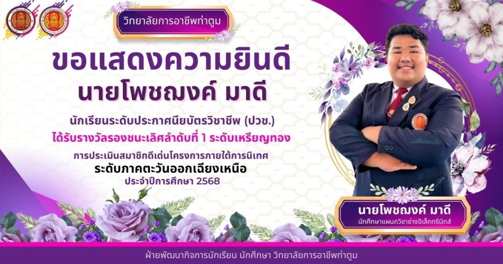 รางวัลรองชนะเลิศอันดับที่ 1 ระดับเหรียญทอง ผลการประเมินสมาชิกดีเด่น ระดับ ประกาศนียบัตรวิชาชีพ “นายโพชฌงค์ มาดี”