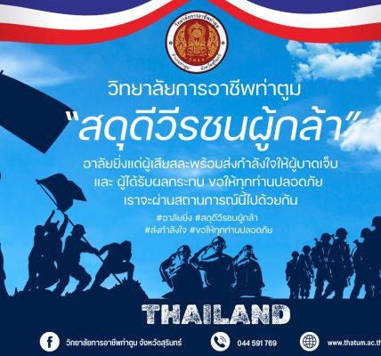 ข่าวประชาสัมพันธ์ วิทยาลัยการอาชีพท่าตูม “ขอสดุดีวีรชนผู้กล้า” อาลัยยิ่งแด่ผู้เสียสละพร้อมส่งกำลังใจให้ผู้บาดเจ็บและ ผู้ได้รับผลกระทบ ขอให้ทุกท่านปลอดภัย เราจะผ่านสถานการณ์นี้ไปด้วยกัน #อาลัยยิ่ง #สดุดีวีรชนผู้กล้า #ส่งกำลังใจ #ขอให้ทุกท่านปลอดภัย admin@thatum1 ธันวาคม 11, 2025